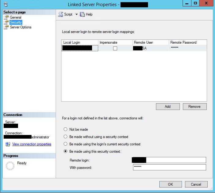 As mentioned above, your linked server properties may look similar to the screen below. ย Here there is an entry in the top section for local server login to remote server login mapping. ย So if we are logged in as the “Local Login” for instance, TESTDOMAINjdoe then we can set the remote user to be SA or another SQL login. ย The way the linked server properties work is if the top section is either blank or doesn’t match, then it goes to the next section which then processes how things are going to be authenticated. ย As you can see below, the radio button “Be made using this security context” is selected. ย This means that we are hard setting a SQL login as a catchall for all other logins passed over to the linked server.