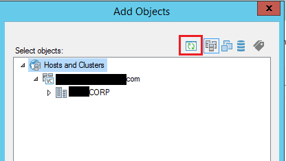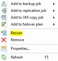 After the rescan, go to your backup job and remove the problematic VM(s) that were previously restored. ย Go back toย Add Objectsย in the job properties and then in the upper part of the Add Objects screen there is a refresh button. ย Click the button and it will refresh the infrastructure. ย After that you can add back the restored VMs.