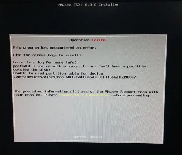 I am not sure why I saw this error on this particular install as I had provisioned a similar set of hardware not long ago and didn’t have any issues. Â However, between different RAID controllers and firmware revisions, there may have been a problem introduced with the specific card in this situation. Â Also, disks can be culprits more often than not if you have a weird partition that may exist for instance that could cause issues.