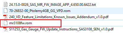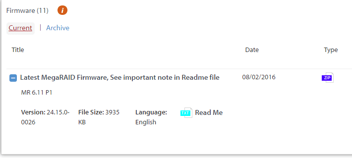 On the Avago site, under Support Documents and Downloads, you will choose your RAID controller.  There are several options under the Downloads section.  However, look for Firmware and expand the box.  You should see the current firmware listed.  As you see below, it is a ZIP file containing the normal readme documentation and the firmware itself.