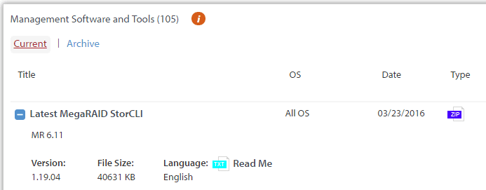To get the StorCLI utility, look for the Management Software and Tools section.  One oddity I noticed was for my 9380-4i4e card, there wasn’t a listing for the StorCLI under the Current list – I had to expand the Archive.  However, when I searched for downloads under the 9380-8e card which is in the same family, there was a StorCLI download under current.