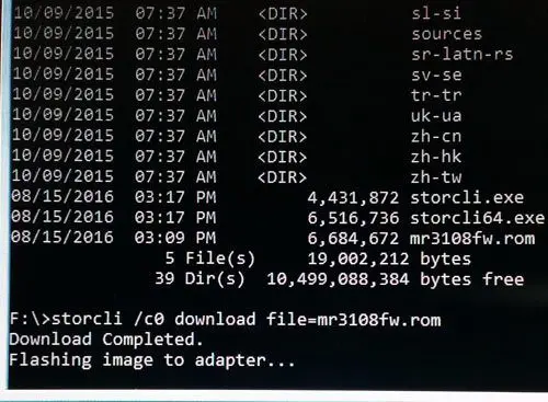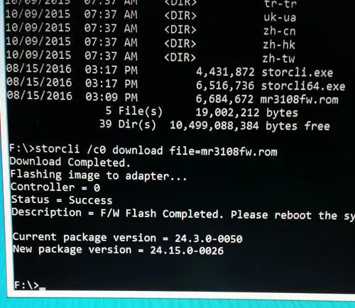 Now all we have left to do is boot from our ADK USB boot disk and run the upgrade process. Â The command line syntax using the storcli command to upgrade firmware is the following: