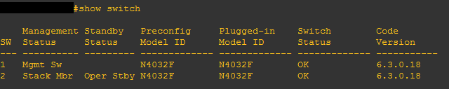 Once both are fully booted, you can issue a show switch and you should see the Mgmt Sw and the Stack Mbr switch as you see below.