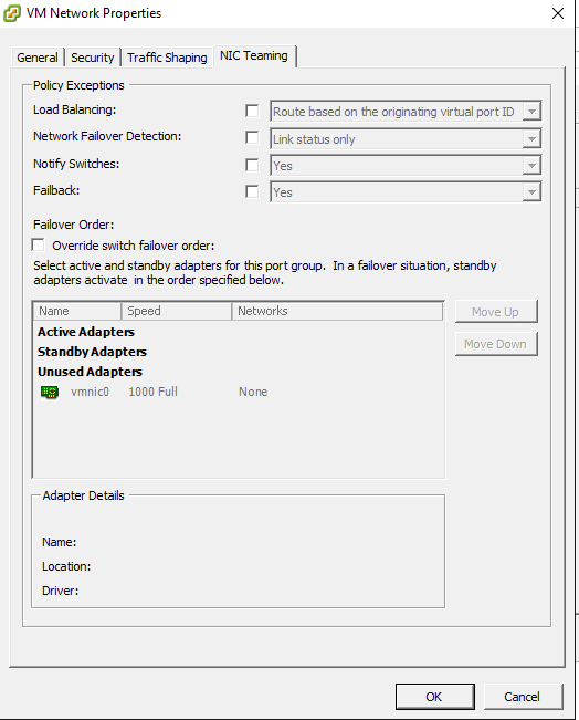 Now looking at the VM Network Properties and then the NIC Teaming tab, notice the state of the active and standby adapters for the port group. The only vmnic that is listed, vmnic0, is set as unused.