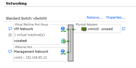 If we look at the networking config on the particular ESXi host housing the vCenter VM, we see that the status of vmnic0 is unused.