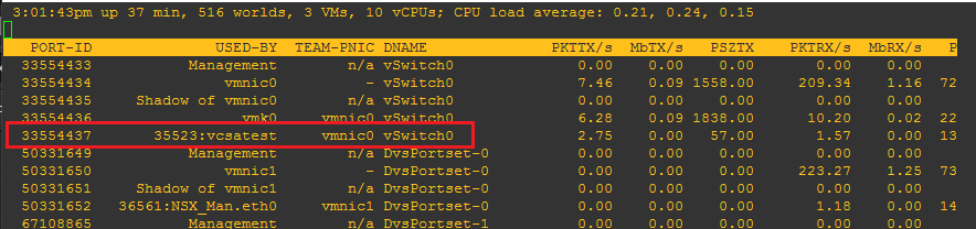 Notice when looking at the vCenter appliance in ESXTOP, the PNIC is showing void.