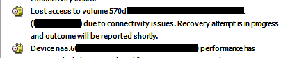 So far, this is an open ended issue that I am dealing with as of late. ย I will update everyone as to any newย findings here on this issue of “lost access to volume due to connectivity issues”. ย Stay tuned!