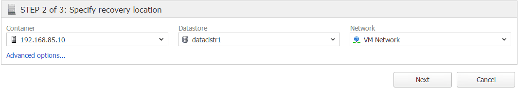 Next, we select the compute, storage, and network resources to restore the VM back to.