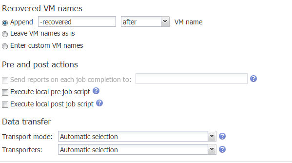 Also, in the advanced options we can control how the naming of the VM happens in the restore as well as any pre or post operations to initiate with the restore.