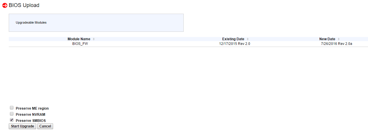 After the upload completes, you will see a screen displaying the existing BIOS date and revision and then showing the New Date and revision of the new file. When you have verified the information, choose the Start Upgrade button.