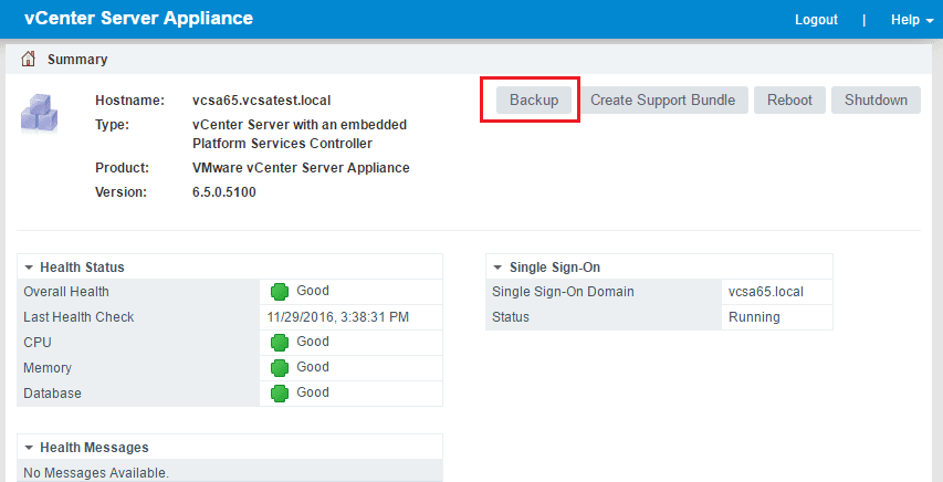 With the new VCSA 6.5 appliance, there is new functionality to backup the VCSA appliance builtin to the VAMI interface. Â You will notice there is a new “Backup” button over in the upper right hand corner. Â Let’s take a look at the new VMware VCSA 6.5 Appliance Backup process.