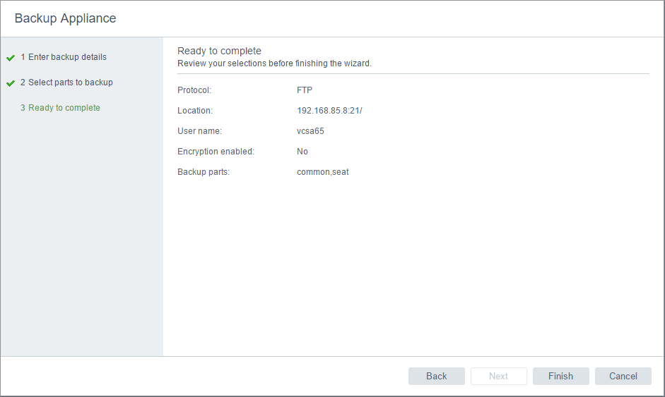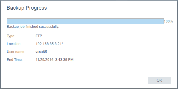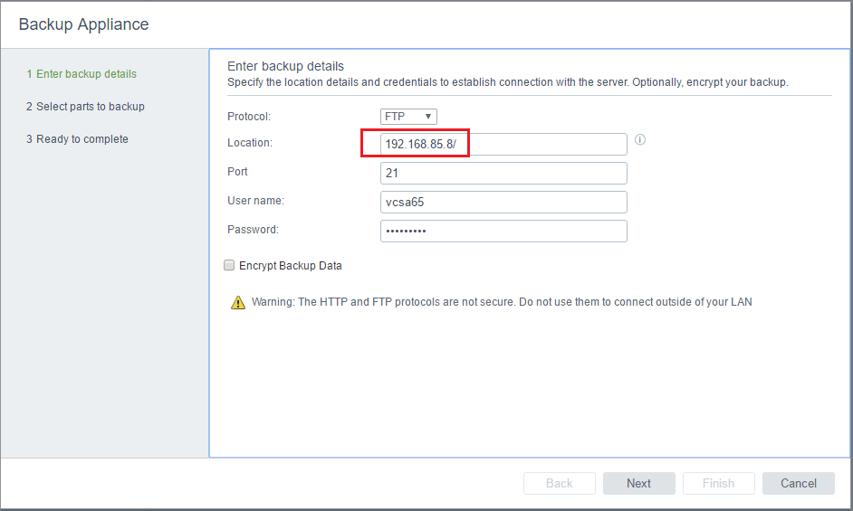After clicking the Backup button, you enter the server and connection information for the VCSA 6.5 appliance to connect to.  I am using a simple Firezilla Windows install for testing the backup functionality.  I will detail more how I set this up in a future post.  One little trick I noticed was necessary at least with firezilla FTP – you need to have a trailing “/” after the server address or it will never connect.  Other than that, it was as simple as entering the user and password.  Also, you can choose to encrypt the data as well.