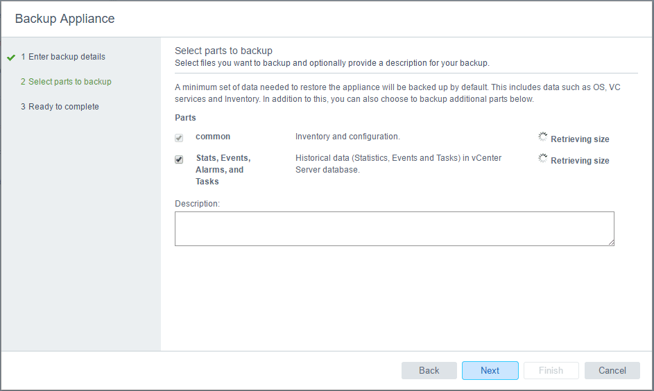 Click Next and you come to the Select parts to backup screen that allows you to choose a couple of options here.  Common – contains inventory and configuration.  Stats, Events, Alarms, and Tasks – contains historical data (statistics, events, and tasks) in the vCenter Server database.