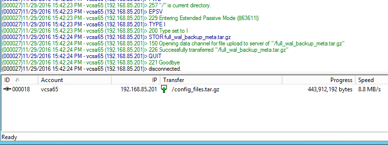 Also, just monitoring the Firezilla side, I see connectivity and activity from the VCSA 6.5 appliance.