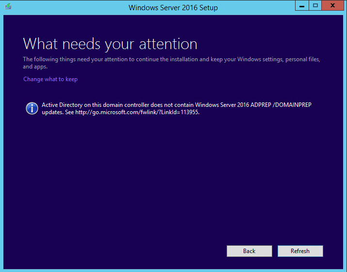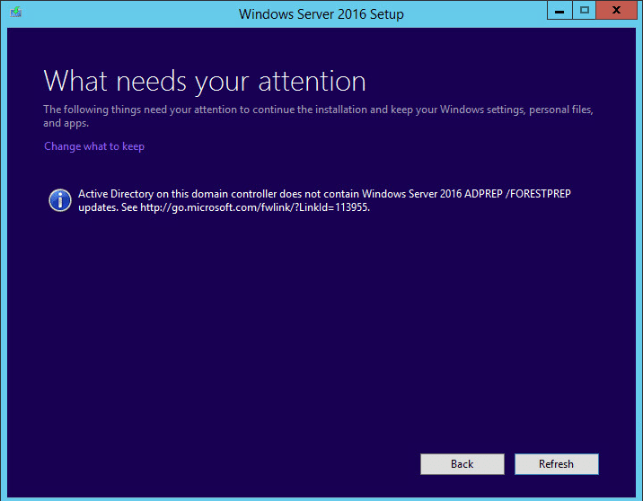 We are prompted that “Active Directory on this domain controller does not contain Windows Server 2016 ADPREP/ FORESTPREP. ย The relevant KB article is found here: ย https://go.microsoft.com/fwlink/?LinkId=113955