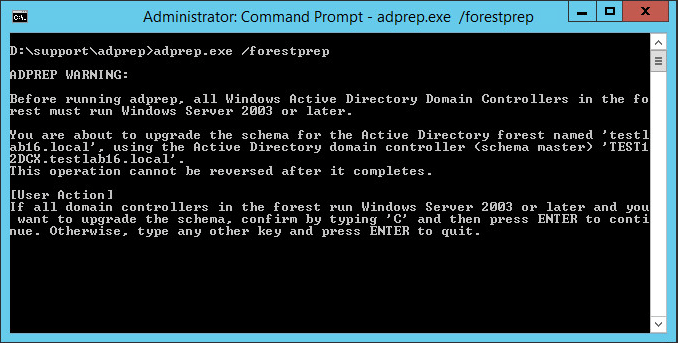 Confirm the forestprep operation by typing a ‘C‘ and then pressingย ENTER.