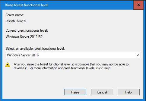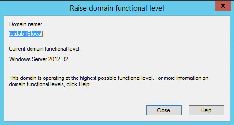 Now, as we can see, when looking at both the forest and domain functional levels, we have theย Windows Server 2016 level available to us.