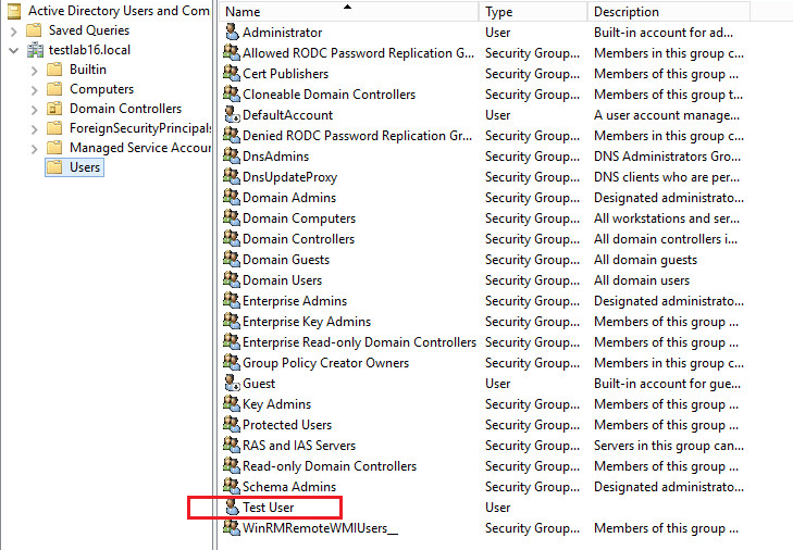 The first check – Can we open Active Directory? ย A quick launch of Active Directory Users and Computers shows AD is alive and well after the upgrade. ย Theย “Test User” ย account I had created beforehand was brought across as we would expect, but a good check of objects coming across with the upgrade.