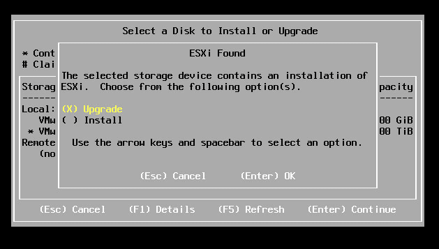 After we have selected the ESXi 6.0 disk, we get the message that states the selected storage deivces contains an installation of ESXi. ย We have the option then to chooseย Upgrade.