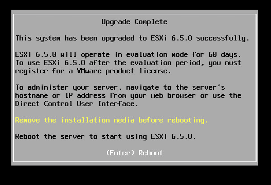 Not long after, we have the message stating the Upgrade is complete and we simply need to reboot the host to instantiate the 6.5 install.