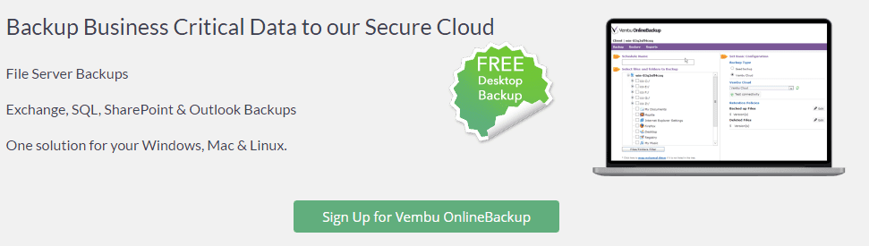 Vembuโs Cloud backup offering is called OnlineBackup and allows SMBs to backup critical files and applications directly to the Vembu Cloud service.