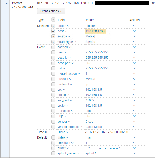 In looking at firewall upgrades for home lab and network, I have been taking a look at a variety of firewalls.  Recently, I was able to get my hands on a Meraki MX64 to try out.  Just a note here, I am going to prepare another post on my thoughts of the Meraki security appliance – likes and dislikes.  One thing became especially clear to me that a con I will mention here is the lack of built in logging visibility from the Meraki cloud interface.  Many suggested that syslog was the only answer here.  I of course looked to Splunk as a known that I had used in the past.  Let’s take a look at how to configure Splunk for Meraki MX firewall logging.