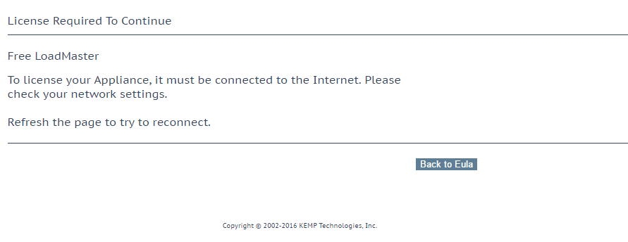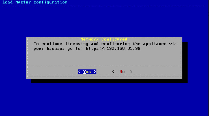 After finalizing the network settings, you will be able to login to the web interface of the Kemp virtual appliance by browsing to the IP address configured.