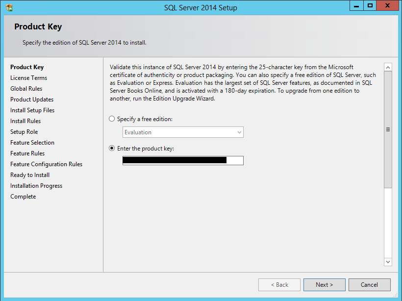 After mounting the SQL 2014 Media, we can enter our product key on the first screen.
