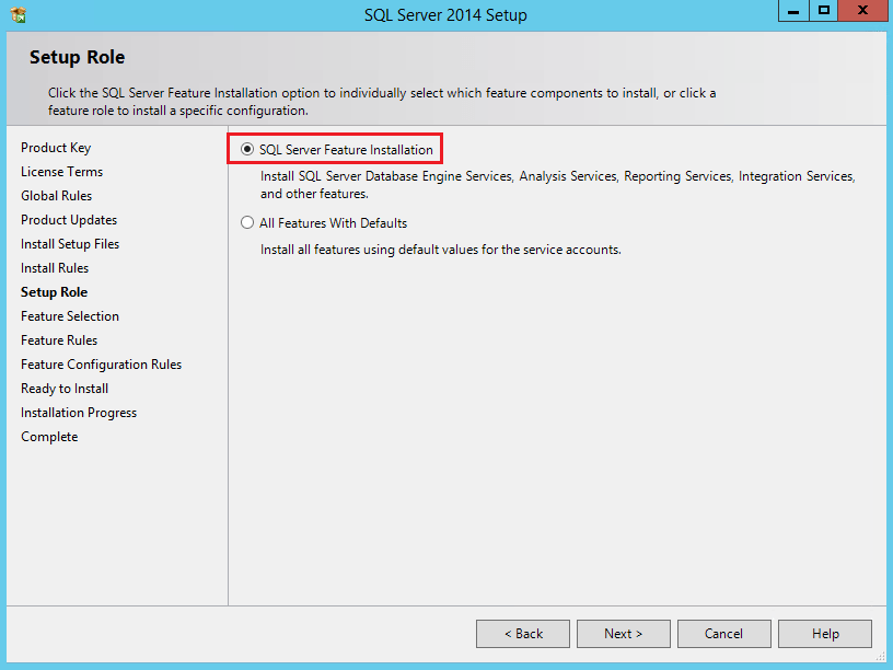 We select theย SQL Server Feature Installationย on the Setup Role screen.