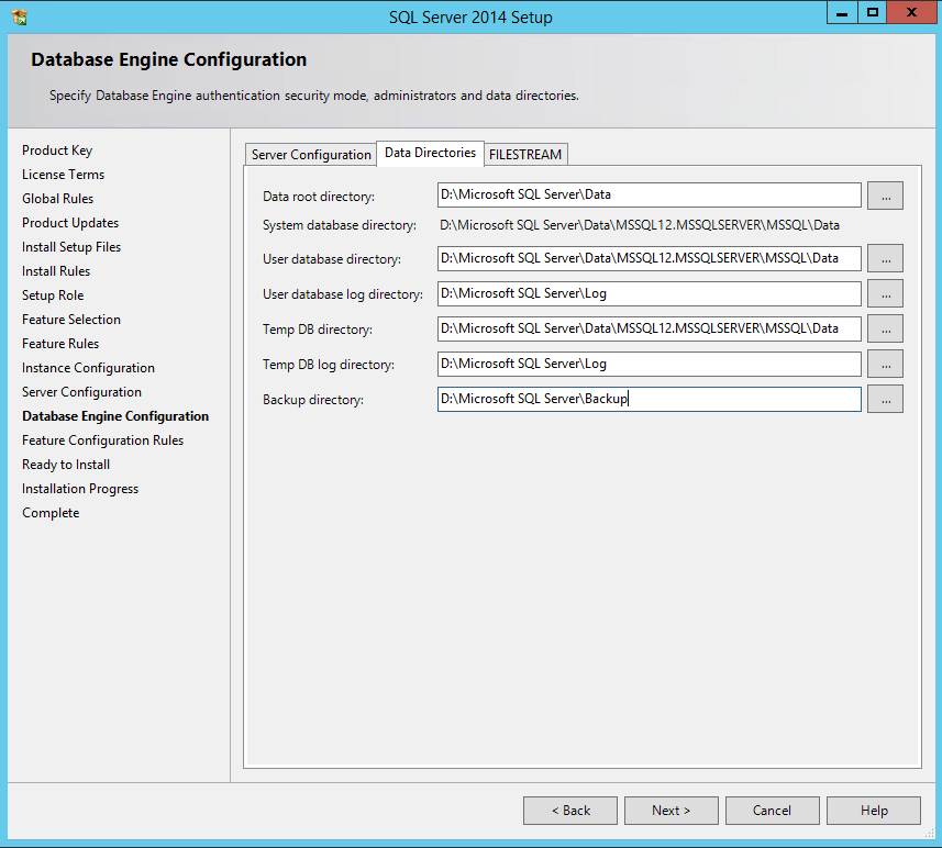 On theย Database Engine Configuration screen, we can setup specific directories if we want to store the database, log, and backup files. ย Sinceย we are using a second partition to house SQL DBs, logs, and backups, we can set those in theย Data Directoriesย tab.