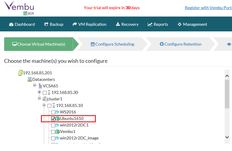 Using the Vembu BDR Suite backup process, VM(s) are backed up to storage as normal on either your physical or virtual Vembu BDR Suite server. In this walkthrough, Vembu BDR Suite is loaded on a guest OS VM located in the vCenter infrastructure. As you can see below, the VM we wish to configure for backup is selected from our vCenter server.