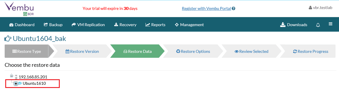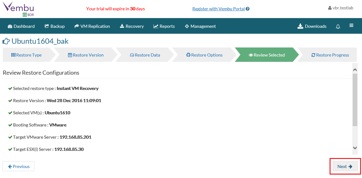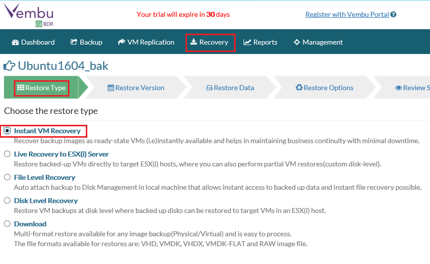 Another great feature of Vembu BDR Suite here is this process is hypervisor agnostic in that it allows you to instantly recover mission critical VMs or even physical machines on a wide range of hypervisors – VMware, Hyper-V, KVM, etc. Let’s take a look at the Quick VM Instant recovery process and the steps involved.