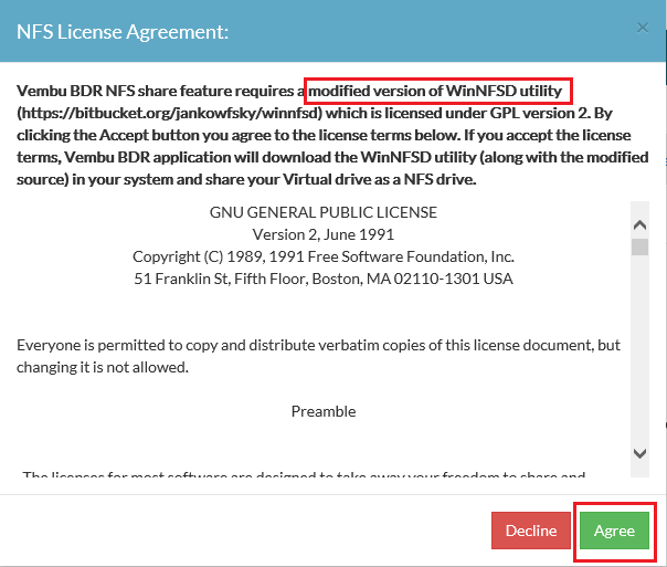 When the BDR backup server is installed on a virtual machine, an NFS share is used to present the VM to the hypervisor for provisioning. Vembu BDR Suite uses a modified version of the WinNFSD utility. Part of the wizard is downloading and installing this GPL open source utility.
