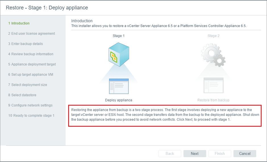 The restore process begins. ย As you can see below, the first stage is toย deploy vCenter Server like a new appliance.