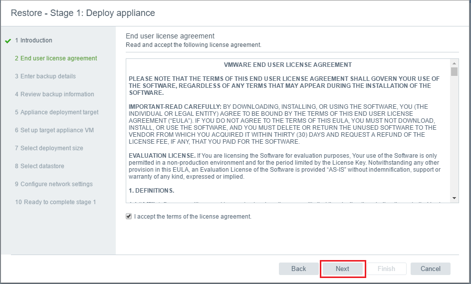 Ready to begin Stage 2 – note that we are told toย Shut down the original backup appliance before you proceed to avoid network conflicts. ย I was actually not able to move past the network configuration screen in the restore process without doing this.