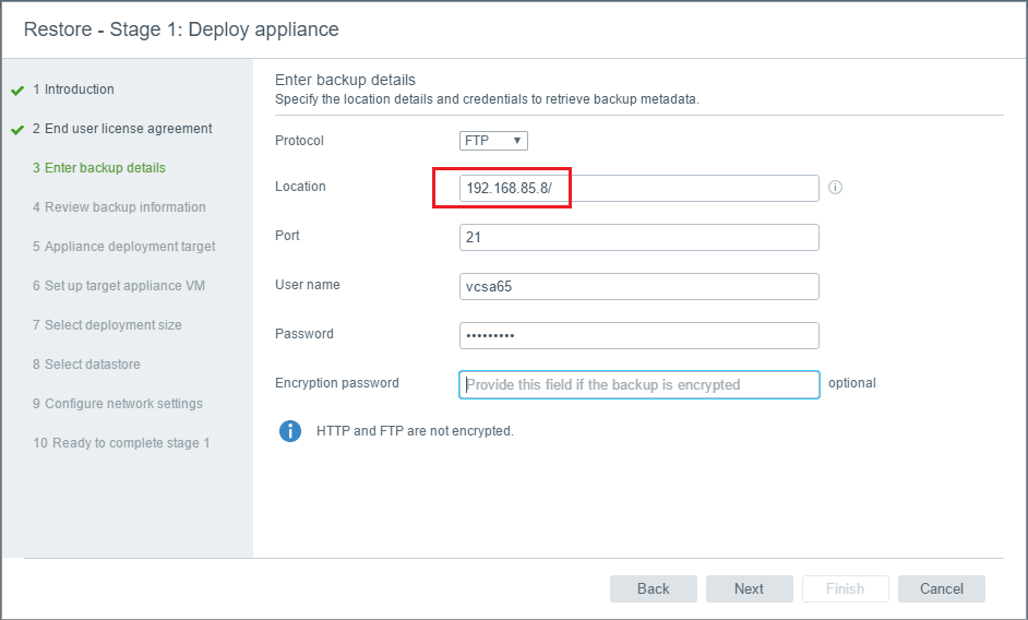 Notice Stage 2 is all about the VMware VCSA 6.5 Appliance Restoreย backup configuration process.
