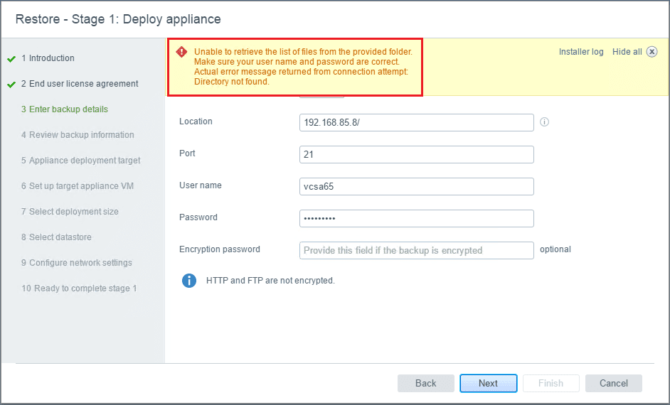 I kept an eye on my Firezilla server and noticed at this point, I saw activity of the backup files being FTP’ed from the Firezilla server to the new VCSA appliance.