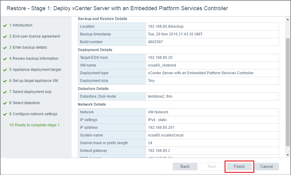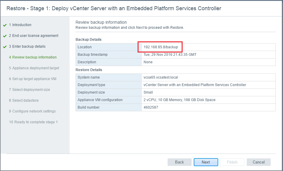 In the last post, we covered the process to backup the new VCSA 6.5 appliance.ย Let’s now take a look at the VMware VCSA 6.5 appliance restore process from the backup file set.