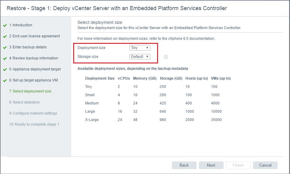 A cool thing about restoring this way is that you have the option to change some of your decisions the first go around. ย If you chose Tiny the first time and now need a larger deployment, you can do that with the restore.