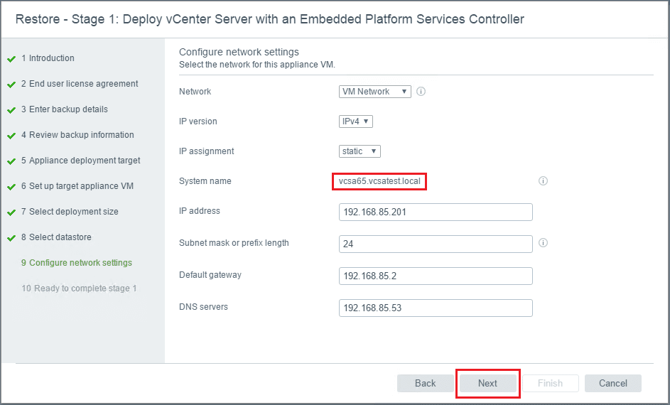 Notice the backup configuration is pulling the name of the vCenter appliance from the backup at this point. ย Also, the network configuration is known and brought forward.