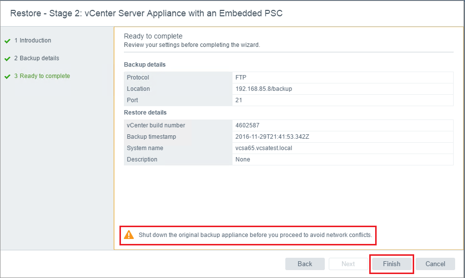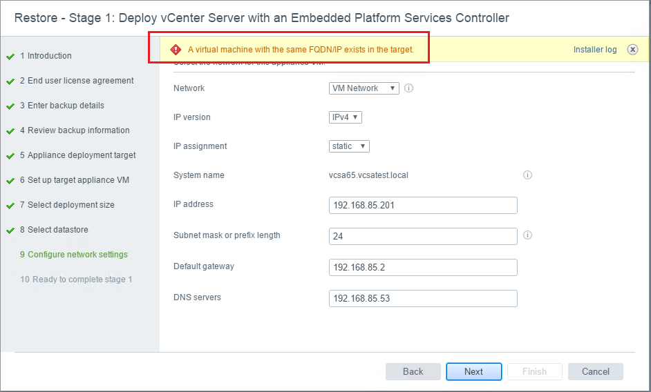 Another interesting detail in the restore process – I received the errorย A virtual machine with the same FQDN/IP exists in the target. ย What is interesting about this is that I hadย disconnected the networkย from the old VCSA appliance. ย So it wasn’t really discovering this at the network level. ย All I had to do to get past this however wasย power off the old VCSA 6.5 appliance – again interesting.