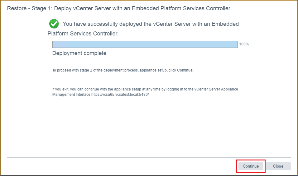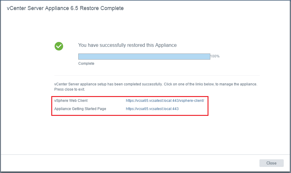 After the backup configuration files are copied over and the restoration works its way through, we get aย Restore Complete dialog directing us to the login pages of our restored VCSA 6.5 appliance.