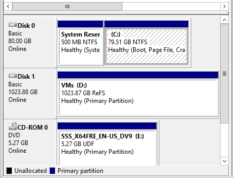 DISKPART> list disk DISKPART> select disk <disk number> DISKPART> online disk DISKPART> attributes disk clear readonly DISKPART> clean DISKPART> convert gpt DISKPART> create partition primary DISKPART> select volume <volume number> DISKPART> format fs=refs label=VMs quick DISKPART> assign letter d DISKPART> list volume