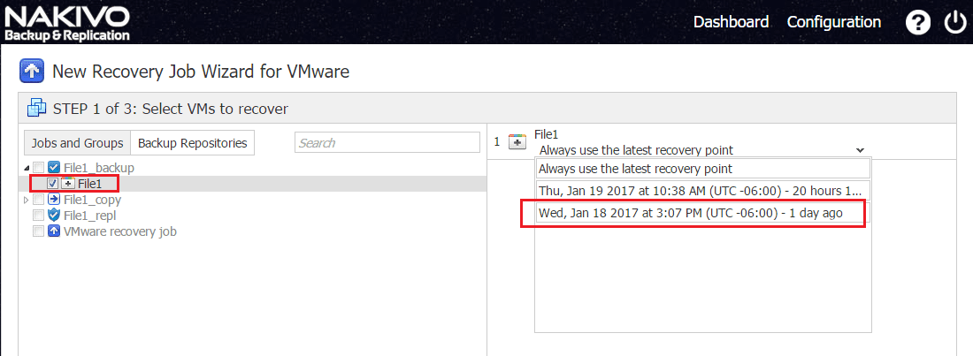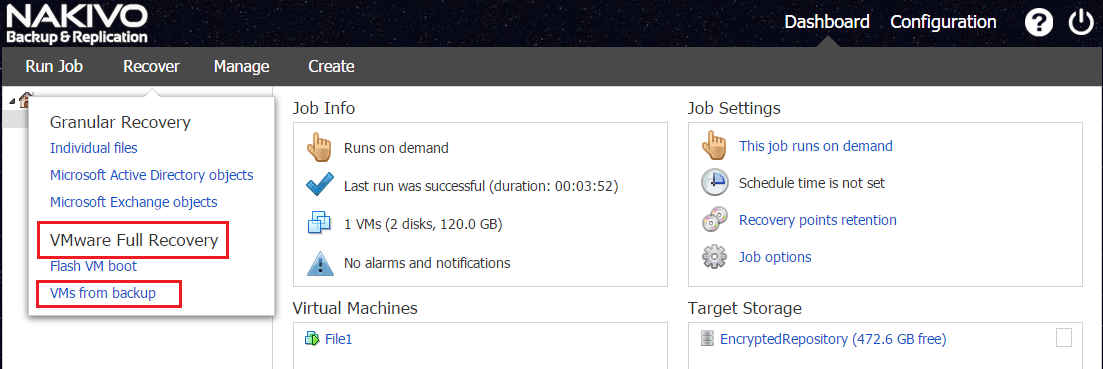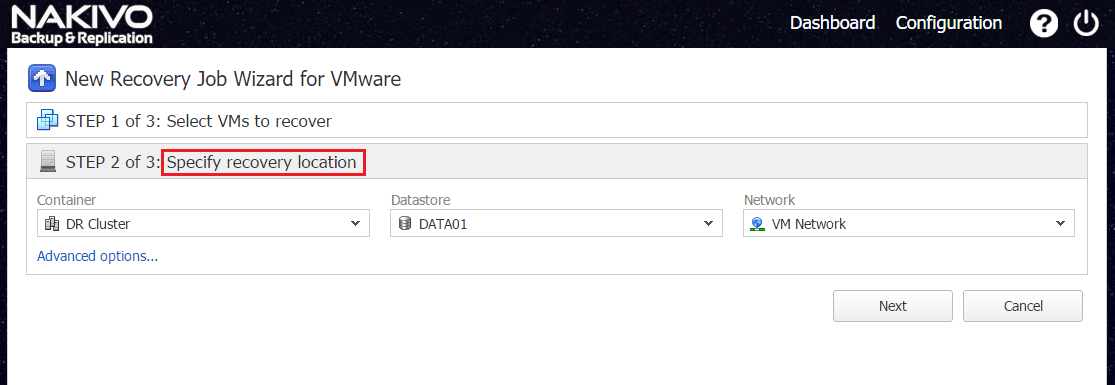 If the integrity of the production site has been compromised by Ransomware and other VMs have been affected as well, we may choose to restore the VM offsite in a clean DR environment. The nice thing about the Full VM Recovery with Nakivo is that it is a full synthetic operation that removes any dependencies on the original environment to bring the VM back online. The last thing you want is to have dependencies on the original site or equipment during a DR scenario caused by Ransomware or other cause.
