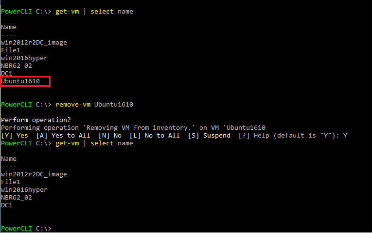 Now all we have to do is run aย remove-vm <VM name>ย to remove the VM that is orphaned. ย Finally, I ran the same get-vm | select name command to see if it was indeed gone and voila!