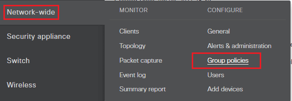 Perhaps the easiest way to throttle bandwidth using an MX Security appliance is to create aย group policy with the bandwidth limits you desire for a particular client(s). ย This is not to be confused with Active Directory group policy as this policy exists in the Meraki cloud and doesn’t interact with Active Directory. ย The configuration is found underย Network-wide >> Group policies.