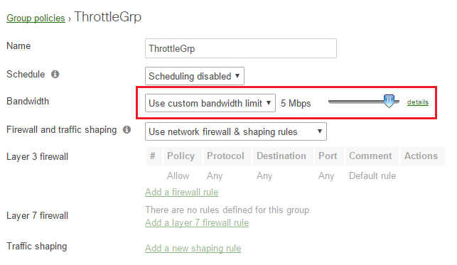 As you can see below, when youย Add a group, you give the group a name first off. ย Also, to keep it simple for the example, the only setting I am changing is theย Bandwidth setting. ย Chooseย Use custom bandwidth limit. ย The slider has presets moving at predefined intervals up to 5 Mbps. ย However, if you want to customize the limit further or provide a different value than the presets the slider offers, you can clickย details.