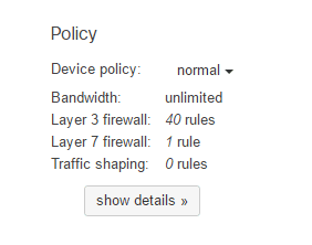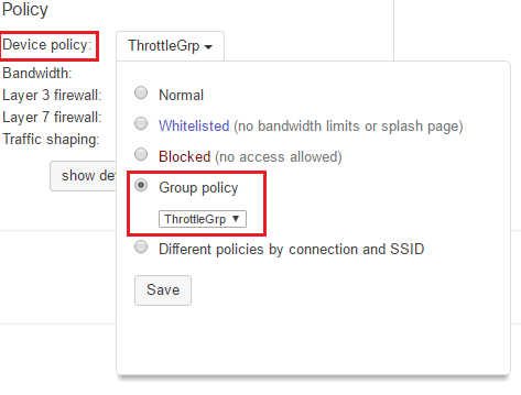 At the bottom of the client configuration page, you will see aย Policy section. ย By default it will look like the following. ย Notice theย Device policy is set toย normal and Bandwidthย isย unlimited. ย This is the default settings for all clients.