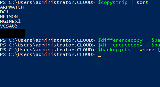Now, to actually compare the sanitized copy names against our backupjobs, we can run the following. ย This will showย only the servers in ourย $backupjobs array that don’t exist in theย $copystrip array.