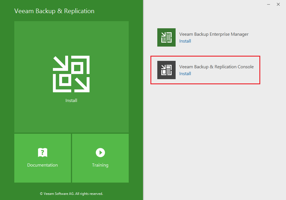 Mount the Veeam Backup and Replication 9.5 ISO or media.  Click the Veeam Backup & Replication Console >> Install.